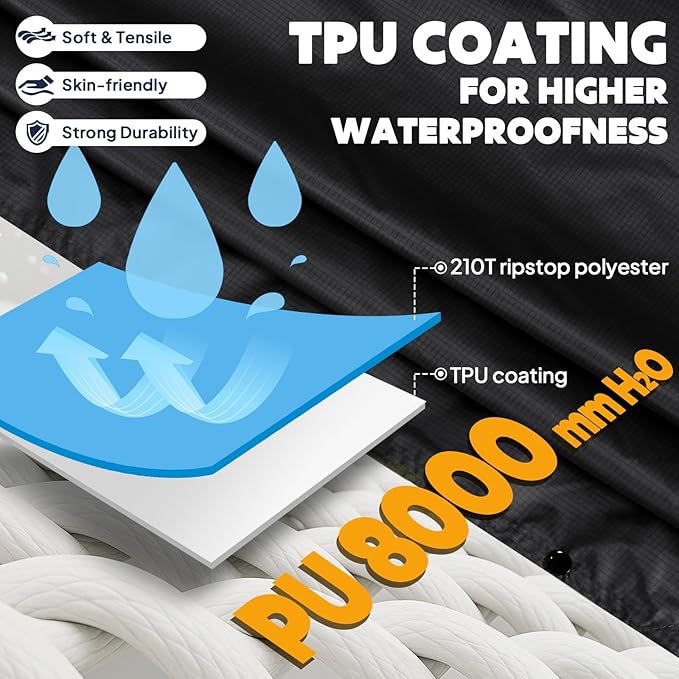 - Waterproof and Sturdy Material: The rain poncho is made of 210T ripstop polyester + TPU coating, this rain poncho is PU8000MM waterproof.To enhance the waterproofing capabilities of a rain poncho,we use techniques such as seam sealing or taping to ensure that water cannot seep through the seams.It comes with a drawstring hood, hook and loop fasteners along the sides ensures the optimal fit,which is good for protecting your head and face.