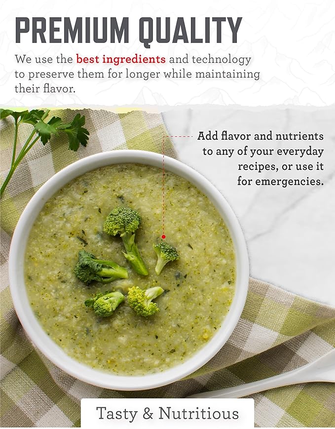 - PREPPER MEALS: Our survival kit offers tasty & nutrient rich options, including freeze dried corn, broccoli, peas, and green beans to enhance your outdoor adventures, backpacking meals, or emergency bunker survival supplies reliably.