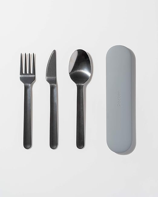 W&P Porter Stainless Steel Utensils with Silicone Carrying Case | Slate | Spoon, Fork & Knife for Meals on the Go | Portable and Compact Set