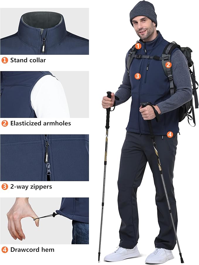 - Softshell Vest for Work & Sports (Abrasion-resistant)----The soft shell fabric is smooth with a little stretch, wipes off easily and washes well. It repels stain, resists abrasion & scratches, great for work and outdoor activities.