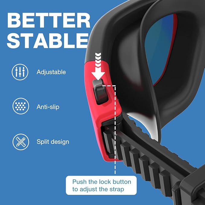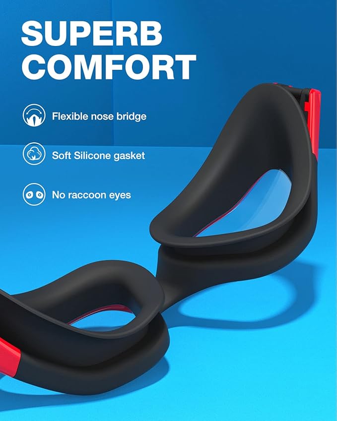 - [Comfortable Wearing] - This swimming goggles come with soft and flexible silicone gasket, adjustable split head strap, TPR ergonomic nose bridge, provides excellent suction and ensure non-slip coverage, that is designed to fit a wider range of face shapes for both women and men
