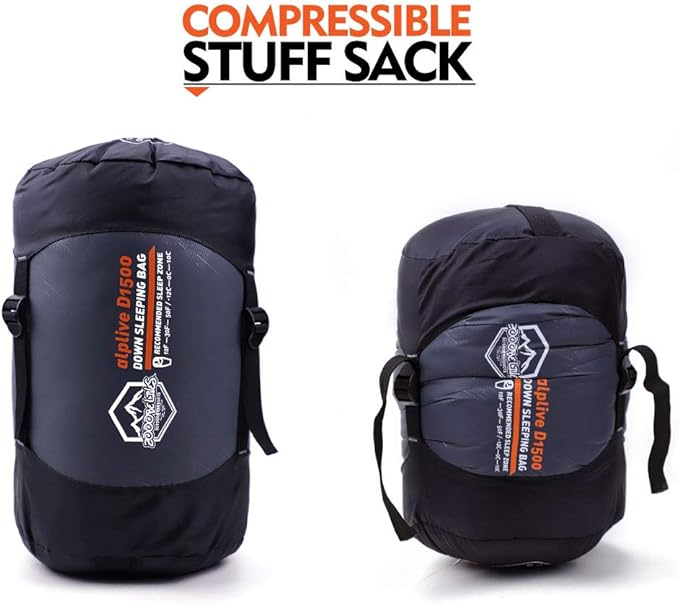 - Special Feature : Alplive D1500 sleeping bag is lightweight, compressible, and insulating for staying comfy on chilly nights., Antisnag YKK zipper works smoothly. Snagless, insulated draft tube., Differentiated hood and neck drawcords simplify adjustments., Insulated face muffler, Anatomic 3D foot box, Contoured mummy hood and flexible baffles at the body’s core all works together to minimize heat loss for greater thermal efficiency., Water-repellent 550-fill-power duck down offers excellent loft and warmth in damp conditions. Alplive D1500 sleeping bag is lightweight, compressible, and insulating for staying comfy on chilly nights., Antisnag YKK zipper works smoothly. Snagless, insulated draft tube., Diff… See more