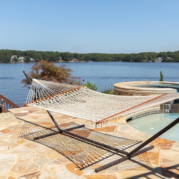 - HARDWOOD SPREADER BARS: Smooth sanded bars with countersunk holes reduce friction on the ropes; keep the bed open to prevent bunching; balanced width promotes stability for everyday backyard patio or garden relaxation with classic style