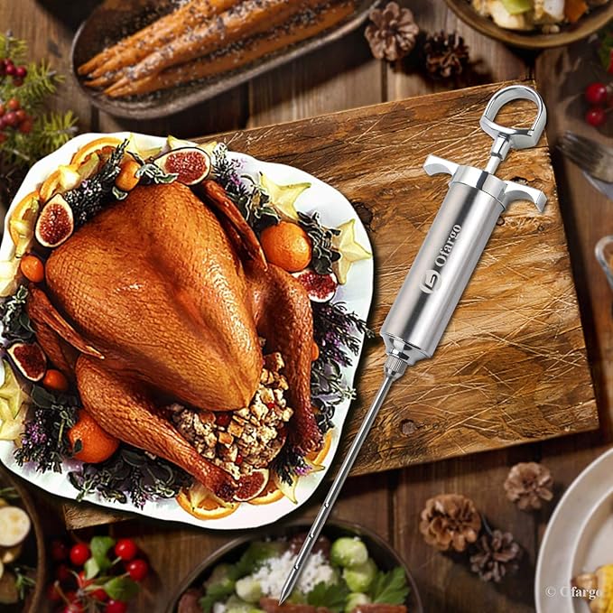 - Easy to Use & Dishwasher Safe: Ergonomic threaded design, easy to assemble or dismantle. 2-oz large capacity injection barrel minimizes refills; plunger handle offers a comfortable grip and friendly pressure control; 4 interchangeable turkey needles multi-holes for deep penetration and sauce distribution, like chunky marinades or liquid brine