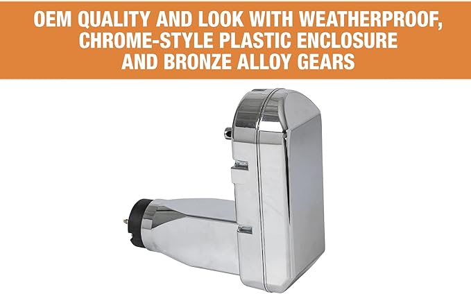 - OEM quality and look with weatherproof, chrome-style plastic enclosure and bronze alloy gears