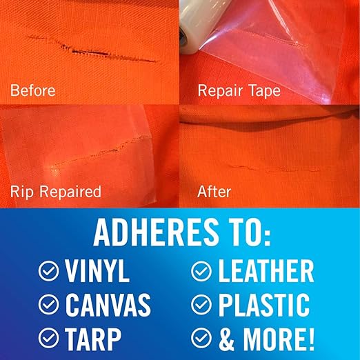 - REPAIRS TEARS & RIPS IN AWNINGS, CANVAS, TENTS & MORE: Our clear repair tape or vinyl repair tape is heavy duty making it a highly effective aid for a pop up camper, bimini top, pontoon boat seat, RV, tarp, canopy, bed, sail and tent repair tape.