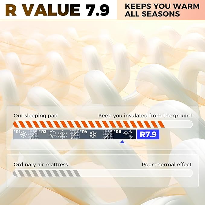 - HIGH R-VALUE 7.9 FOR WARMTH AND COMFORT: The KingCamp Double Sleeping Pad boasts an impressive R-value of 7.9, providing superior insulation to keep you warm even in extreme cold conditions. Perfect for four-season camping, this sleeping pad ensures you stay comfortable and cozy, whether you're camping in winter or braving chilly nights.