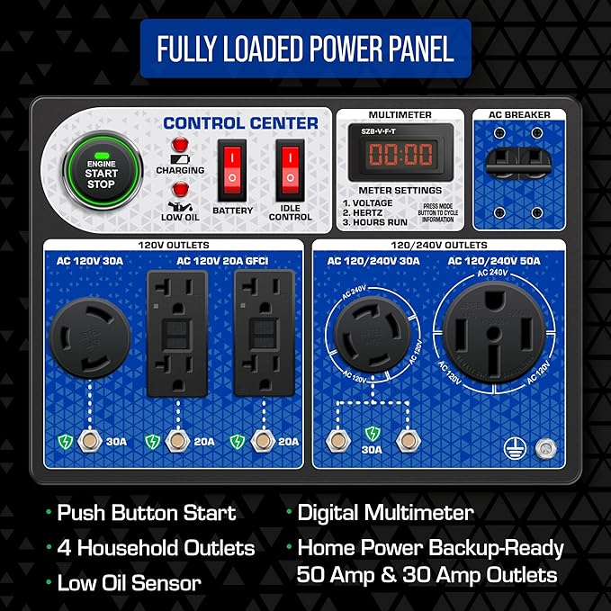 - The fully loaded power panel includes four 120V GFCI household outlets, one 120V 30AMP outlet, one 120/240V 30AMP twist-lock outlet, and a heavy-duty 120/240V 50AMP outlet making it transfer switch ready!