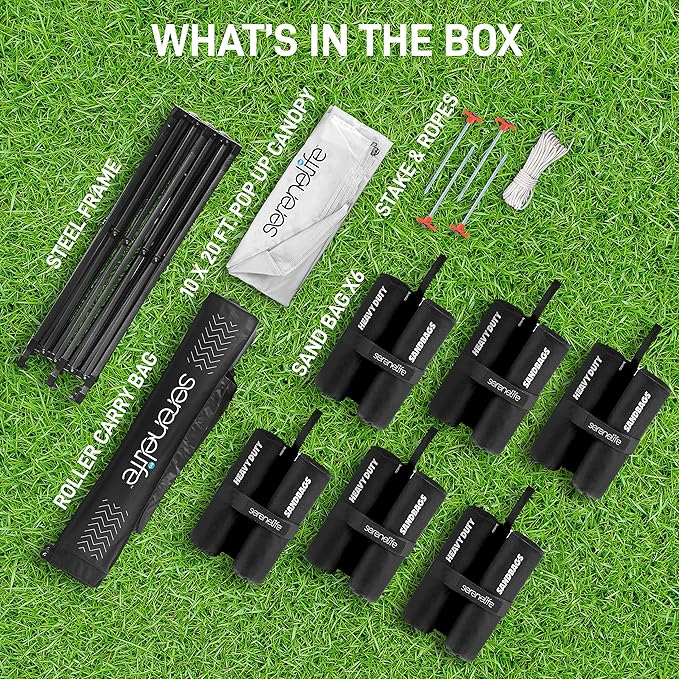 - WHEELED CARRY BAG: This heavy-duty canopy set comes w/ wheel roller carry bag for portability and easy storage, (4) 35 lb sandbag, & stake & ropes. Perfect for beach, camping, backyard party, picnic, garden wedding event, outdoor sport & more