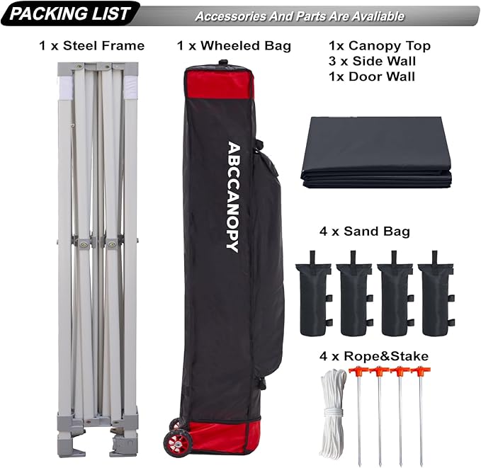 - WHAT IS INCLUDED - Commercial 8'x12' Pop Up Canopy Frame, 8'x12' Canopy Top Cover, 3 Removable Side Walls, 1 Door Wall. Roller Bag,4 Weight Bags, 4 stake and ropes.The upgraded style roller bag is more rugged and durable. One year after-sale protection for frame, six months after-sale protection for fabrics and accessories.