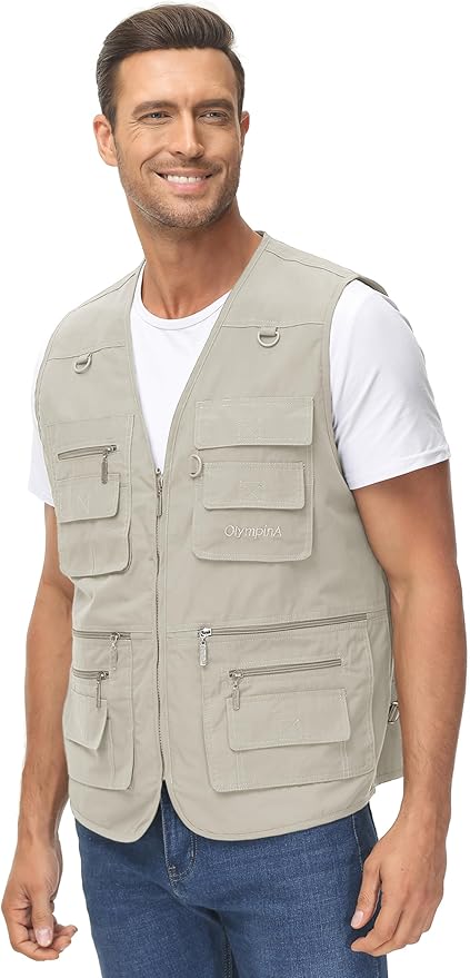 - Features: Zipper front, V neck, 14 functional pockets and 3 "D" rings, serves for travel, volunteer, hiking or just for very tasteful casual wear