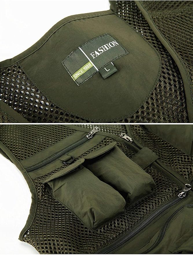 • Outside pockets: 7 front velcro pockets can store essential stuff; 6 zipper pockets are quite useful when fishing to carry assorted items on your person vice carrying a tackle box; For photographers, the puffy pockets on the bottom hold a camera battery, a lens blower and wipe cloths, remotes for flash
