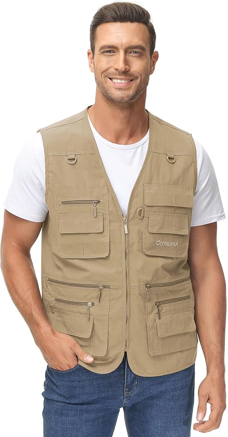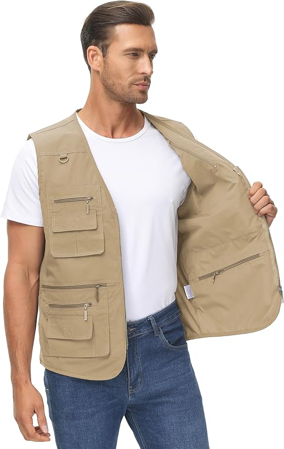 - Multi-pockets: Front pockets: 5 zipper pockets and 5 velcro pockets; Inner pockets: 2 upper slant zip pockets and 2 bottom pockets; The front large pocket can hold a pair of 10x42 binoculars; A lightweight vest could hold your wallet, cellphone, car keys, etc