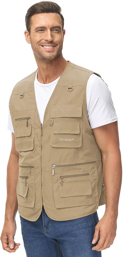 - Features: Zipper front, V neck, 14 functional pockets and 3 "D" rings, serves for travel, volunteer, hiking or just for very tasteful casual wear