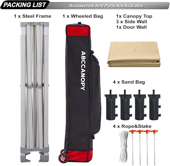 - WHAT IS INCLUDED - Commercial 10'x15' Pop Up Canopy Frame, 10'x15' Canopy Top Cover, 3 Removable Side Walls, 1 Door Wall. Roller Bag,4 Weight Bags, 4 stake and ropes.The upgraded style roller bag is more rugged and durable. One year after-sale protection for frame, six months after-sale protection for fabrics and accessories.