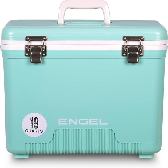 - ENGEL HARD SHELL DRYBOX FISHING COOLER: Stainless Steel industrial strength latches and hinged lid for quick and access to food and drinks; Keeps ice for up to two days and holds up to 30 cans with a 2:1 ratio of ice to cans.