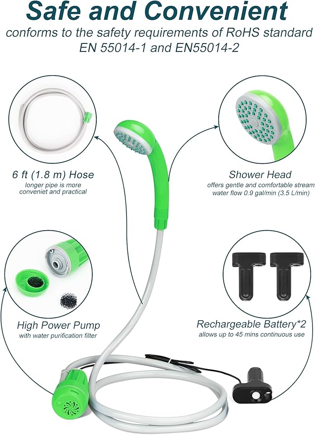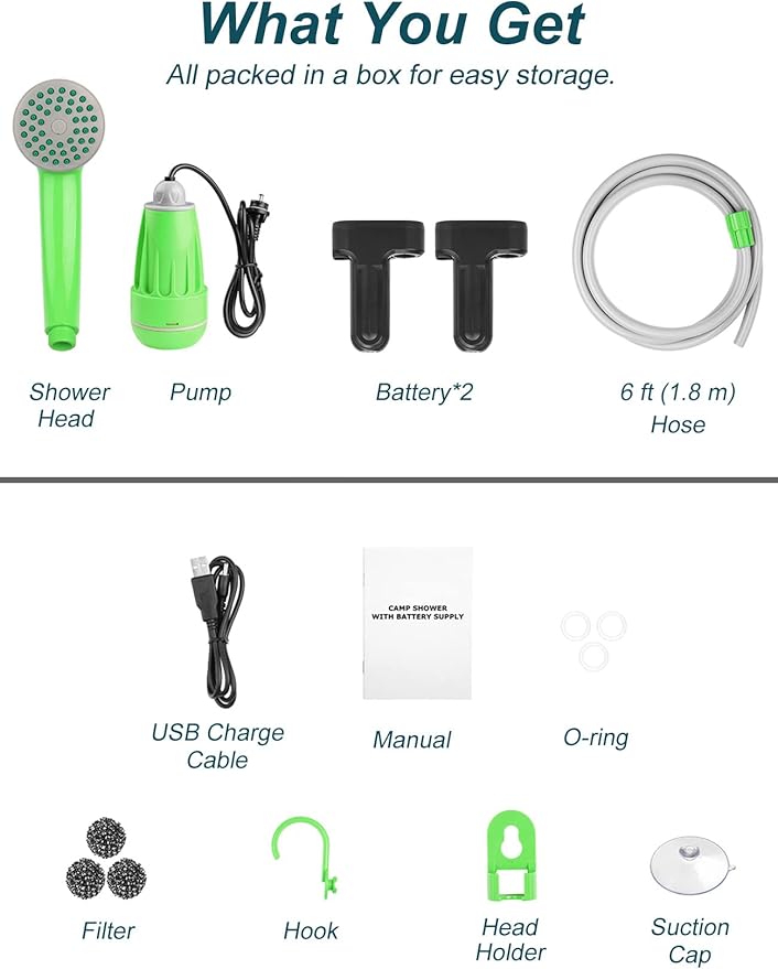 - EASY ASSEMBLY AND OPERATION: Attach pump and shower head to the hose. Fully immerse the pump in water and press the switch on battery to start. The camping shower offers gentle and comfortable stream at 0.9 gal/min (3.5 L/min).