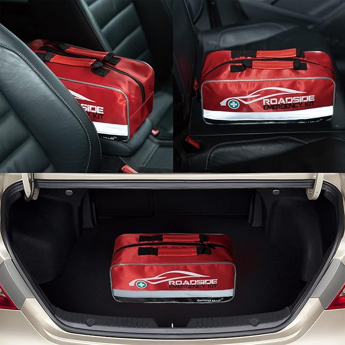 General Medi 127-Pieces Roadside Car Emergency Kit Include Mini First Aid Kit, Jumper Cables,Tow Rope, Bandage, Safety Vest, Emergency Triangle, All in One Pack