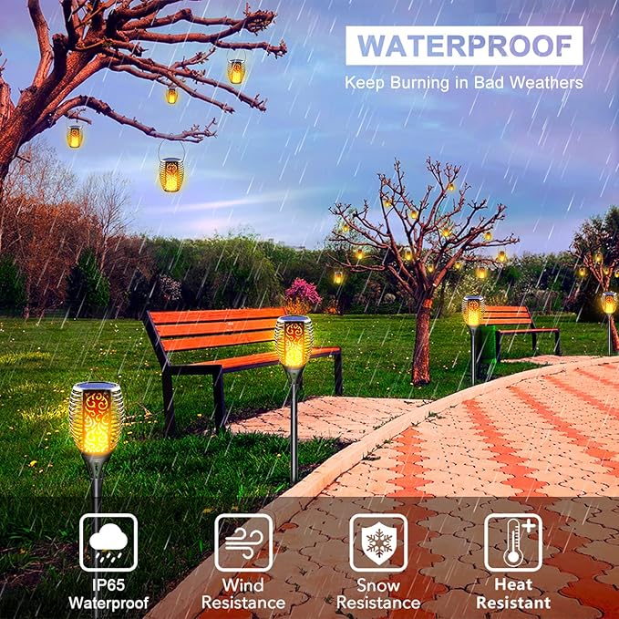 - Weatherproof and Durable: The exterior of our outdoor solar torch lamps is made of high-grade, upgraded ABS materials, ensuring its longevity and high-quality performance, durable and IP65 Waterproof. These products can withstand all weather conditions, including rain, snow, and frost, and are perfect for outdoor activities