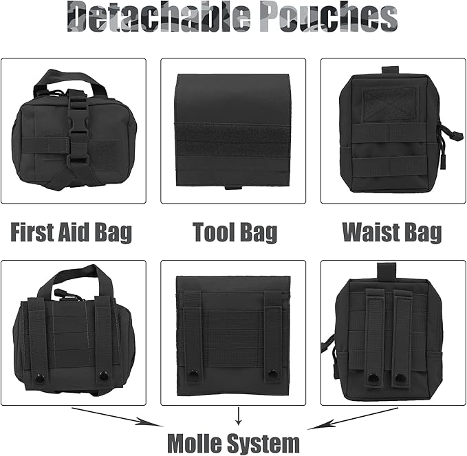 - [MOLLE SYSTEM & 3 DETACHABLE POUCHES] It comes with 3 detachable pouches (1 Molle Waist Bag, 1 Molle Tool Pouch, 1 Molle First Aid Bag). Both sides of the vest are molle-type designed, so you can move the pouches around to balance out the weight.