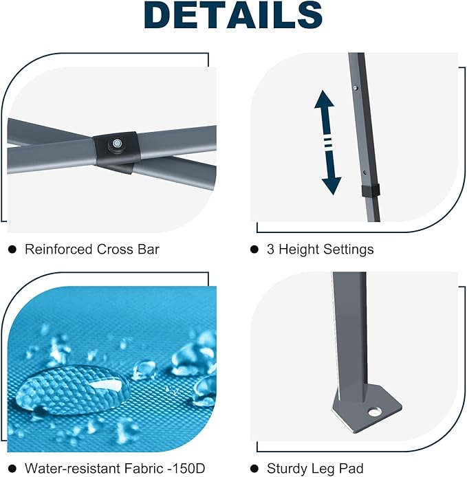 - ✅One Minute to Set Up: 1.Take the fully assembled frame with top out of the bag and pull it open. 2.Place the fabrics over the frame and extend the legs. 3.Adjust the height.Quick and simple.
