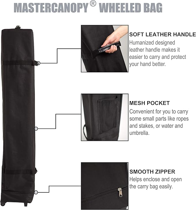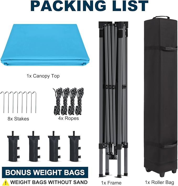 - ✅Package includes: 1 Canopy Frame, 1 Canopy Top, 4 Sand Bags, 4 Ropes, 8 Stakes and 1 Wheeled Bag, which is crafted of 600D PVC coated fabric with reinforced handles.