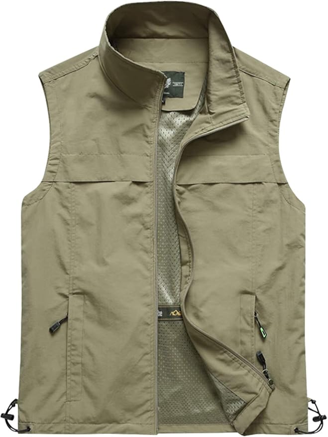 - Design:Men's fishing vest ,zip up closure, multi pockets, stand collar,Mesh lining, lightweight and breathable, drawstring in the hem.