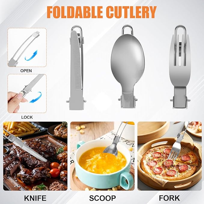 - Fast-Ignition Stove & Smart Design: Features a reliable mini stove noted for easy lighting. Foldable stainless steel utensils and collapsible stove maximize space efficiency. Heat-resistant handles stay cooler during cooking (use caution). Rust-resistant construction ensures dependable performance.