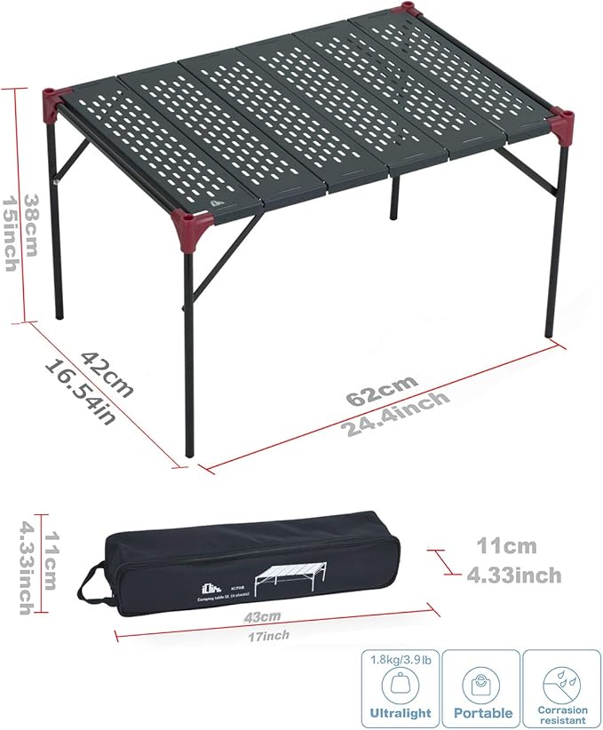 - Ultralight and compact, made of high quality aluminum alloy 6061, Max Load 66 lbs, packed size 17 × 4.33 × 4.33 inches; Hollow out tabletop to reduce weight and won’t hold water.