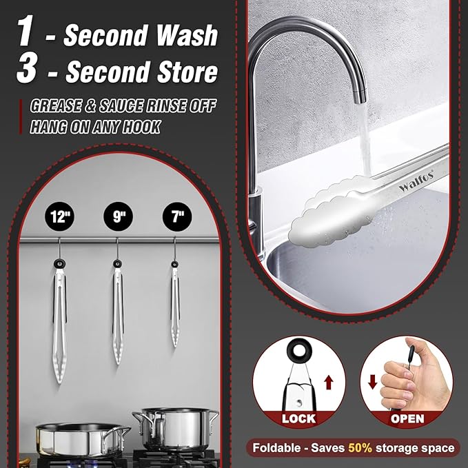 - ★LOCKING MECHANISM & PULL-RING TECHNOLOGY -WALFOS ring-pull technology locking tongs will keep your tongs from opening and closing accidentally which will allow you to facilitate better control while using them. And can be conveniently dried and stored.