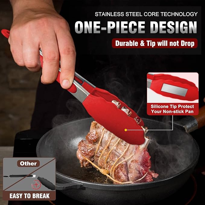 - ✓NON STICK SILICONE TIP, won't MELT, RUST OR FLAKE-The tip is made of food-grade and BPA free silicone, which is safety-tested, heat resistant up to 480°F and will never rust. Food tongs with non-stick silicone tips protect your cookware from damage, easy to clean and dishwasher safe.