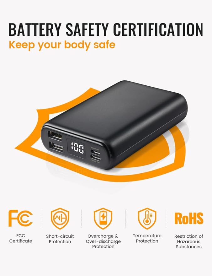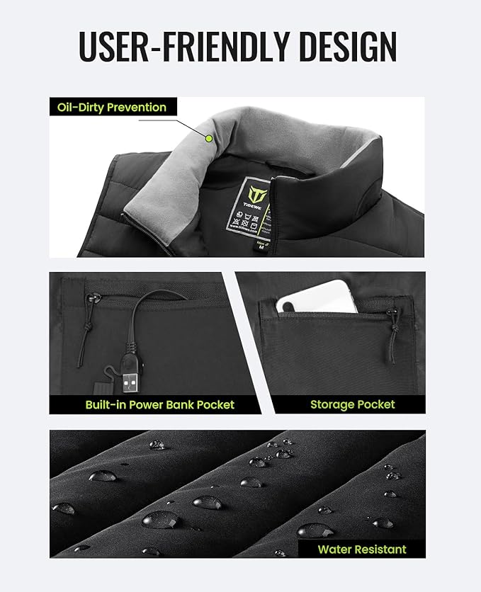 - 【User-Friendly】 Quick charge and up to 10 hours working by portable-convenient 10000mAh power bank. 2 USB ports are added on the power bank, with which you can heat your vest and charge your phone at the same time. The collar is made of oil resistant material, keeping the vest clean. The heated vest is designed with several pockets, convenient for you to storage your phone, wallet, keys as well as small gears for your outdoor activity.