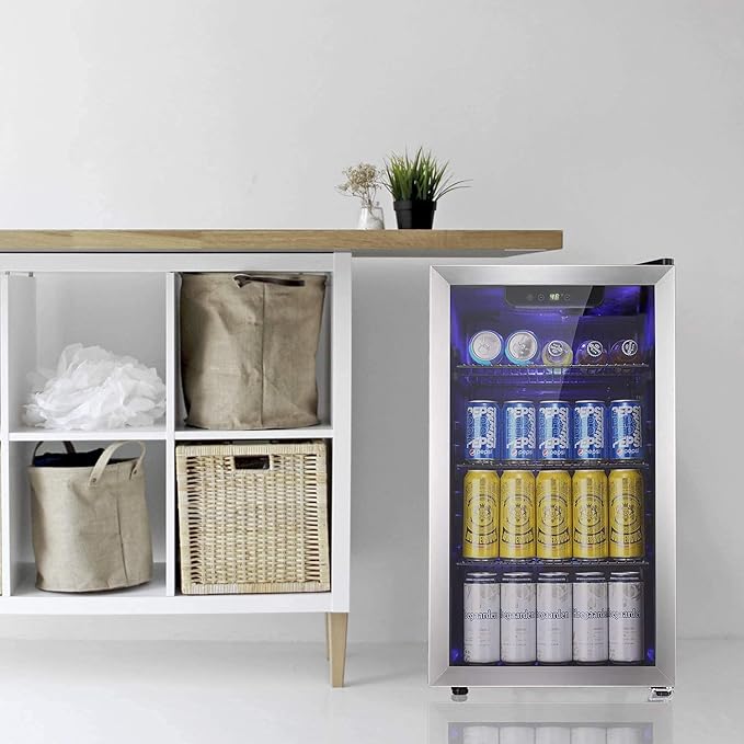 - ESSECTIVE BEVERAGE COOLER-This beverage refrigerator runs on a powerful but quiet compressor. Soft LED light making it easier to find a drink.The shelf is removable and can control the interior space.