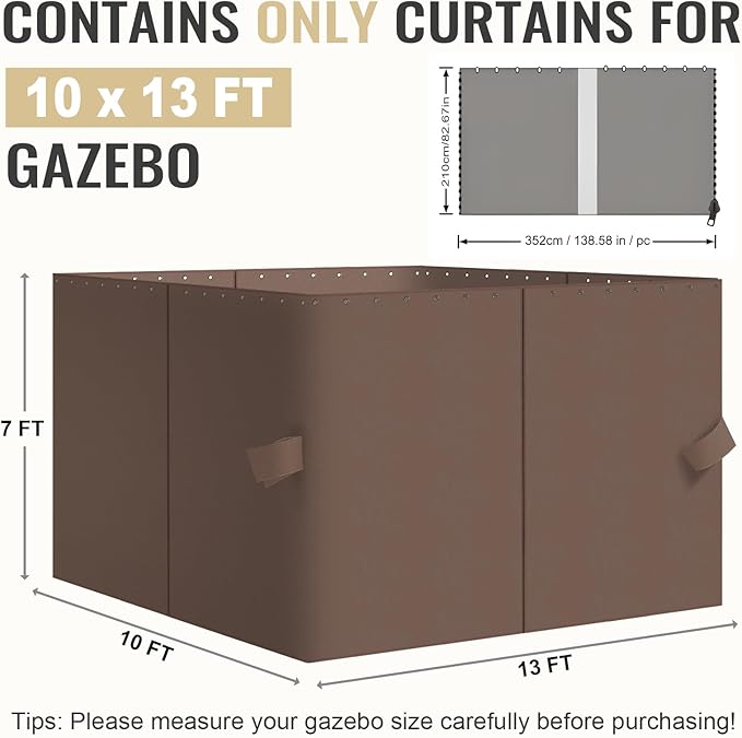 - UNIVERSAL DIMENSION: 4-panel universal sidewall gazebo curtains are designed to perfectly complement most 10'x10' 10'x12' 10'x13' 12'x12' 12'x14' 12'x16' gazebos. We kindly advise you to measure your gazebo before making a purchase