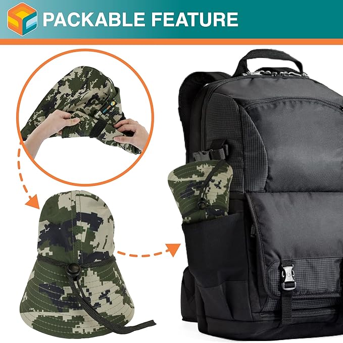 - UV SUN PROTECTION FISHERMAN HAT: Large wide brimmed fishing bucket hat will provide 360 protection and shade for your head, face, and neck. The caps long neck flap adds protection for your back neck and ears. Sun blocking UPF50+ sun hat will block both UVA and UVB rays for ultimate coverage. Go out explore and adventure without fearing nature's elements with this water resistant, windproof, and breathable sun hat with neck flap.
