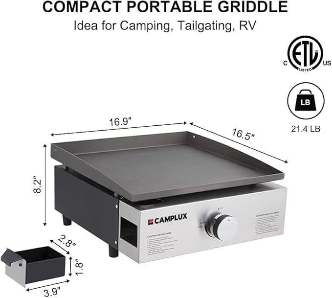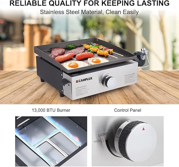 Camplux Propane Gas Grill,Flat Top Grill Station for Kitchen,Camping,Outdoor,Tabletop -Stainless Steel BBQ Griddle with Knobs & Ignition,17inch