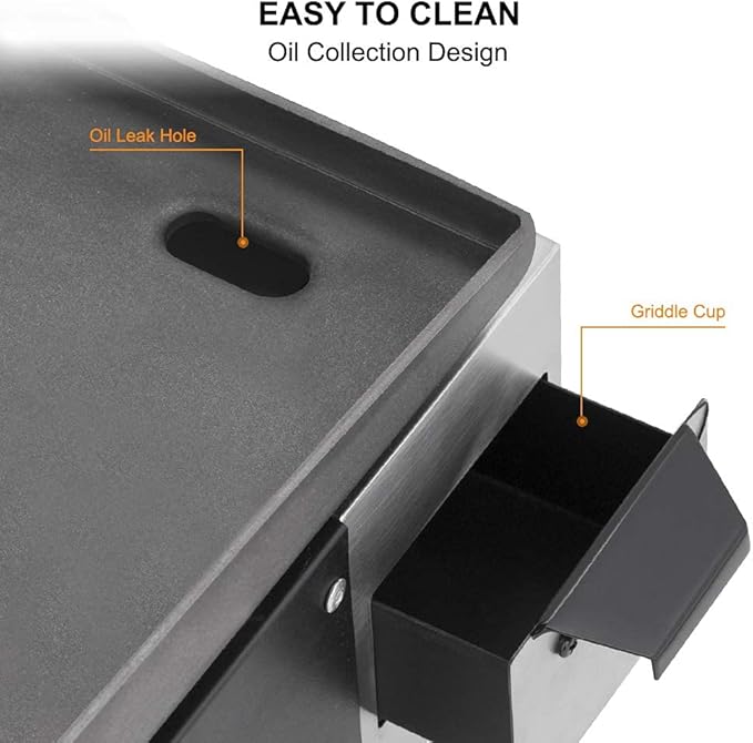 - 【Easy to Clean】-- Flat top griddle is not easy to stick, and grease cup are detachable for washing. Turn your griddle top up to a high heat and then squirt water on them, use a scraper and paper towels after use.