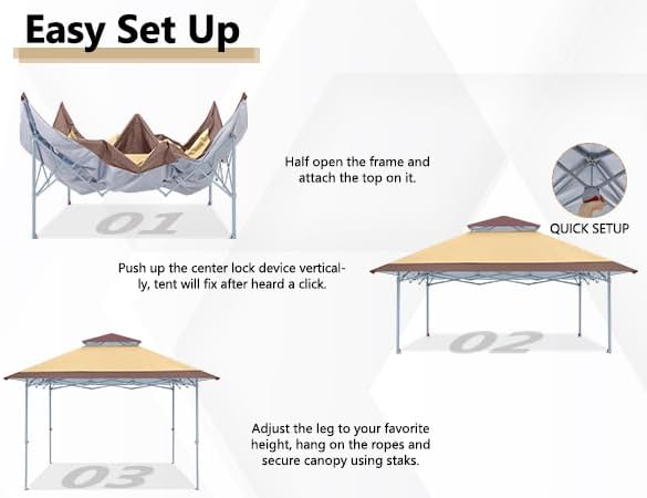 - 【EASY SETUP】The COOSHADE 13x13 canopy tent is designed with fully assembled One-Piece frame in high gauge sturdy metal no tools needed,seamlessly enables set-up in one minute.Super strong double truss one piece frame with full awnings comes completely assembled. And the eaves can be automatically extending when open the pop up gazebo opens without any additional manual assembly.