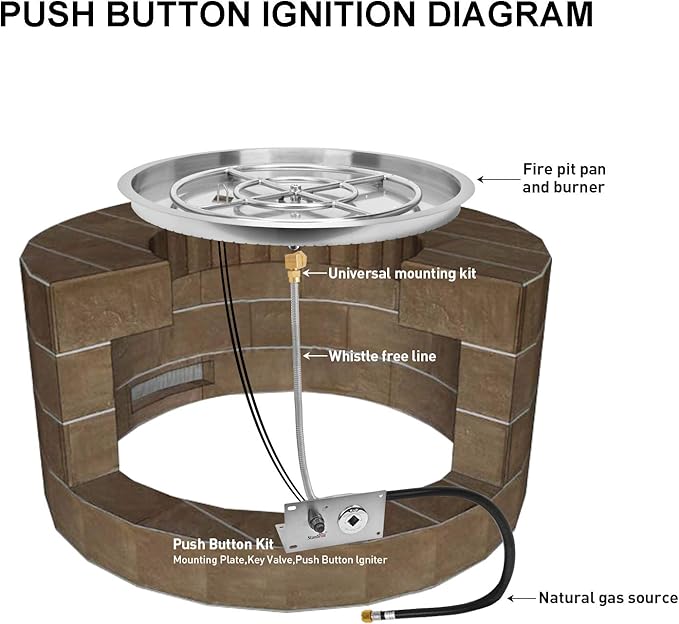 - Including a burner pan, Ignition kit with shut-off valve, 24” non-whistle stainless steel gas line, 5 ft gas hose and fittings