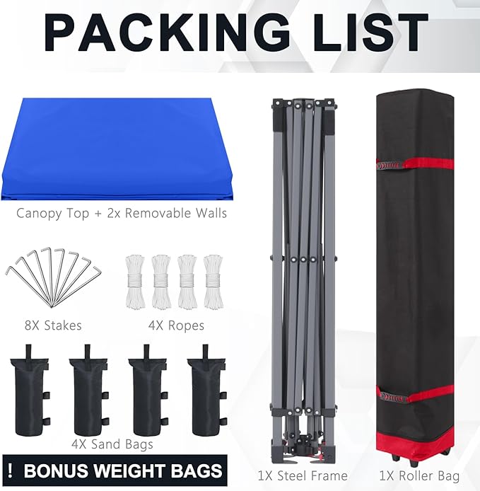 - 【PARTS INCLUDED】Fully assembled powder-coated steel frame,oxford fabric silver coated canopy top,2 Removable Side Walls,600D heavy stock wear resistant roller bag,4Xsand bags,8Xstakes and 4Xropes
