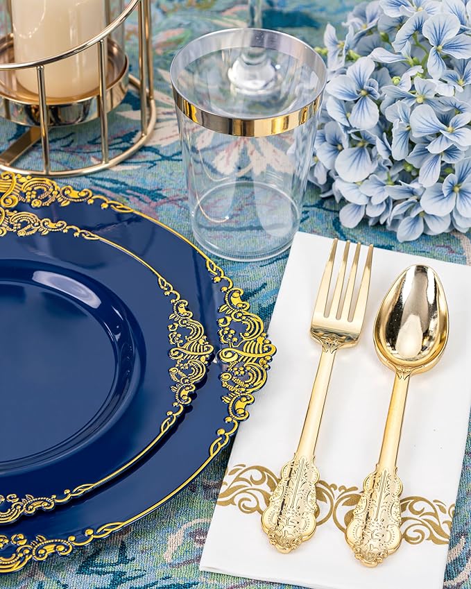 - COMPLETE TABLEWARE SET:175PCS Navy with gold plastic plates set include 50 white wedding plates with gold trim,75 Silverware with White handle,25cups,25 napkins,therefore,there’s no necessary to purchase any other stuff cause everything you need included.