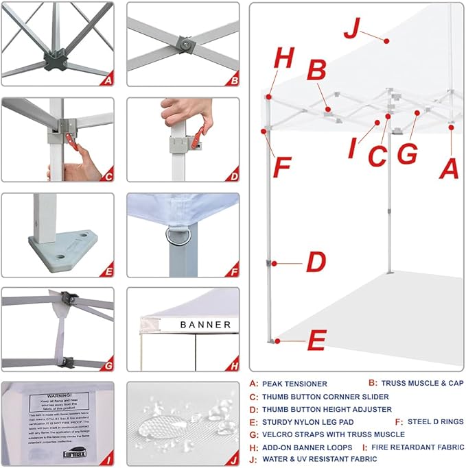 - 8x8 canopy tent fabric: CPAI-84,NFPA 701 & ULC S109 fire retardant certificated polyester PU coated to block about 99% UV rays. Stitching lines are all seam sealed to prevent water penetrate from seams to make our canopy tent water-resistant. Pop up canopy top front valance with 4 name Banner sleeve to customize and personalize your Shelter. Help you attract customers. Steel D rings on each corner, easy to use a rope to secure your canopy.