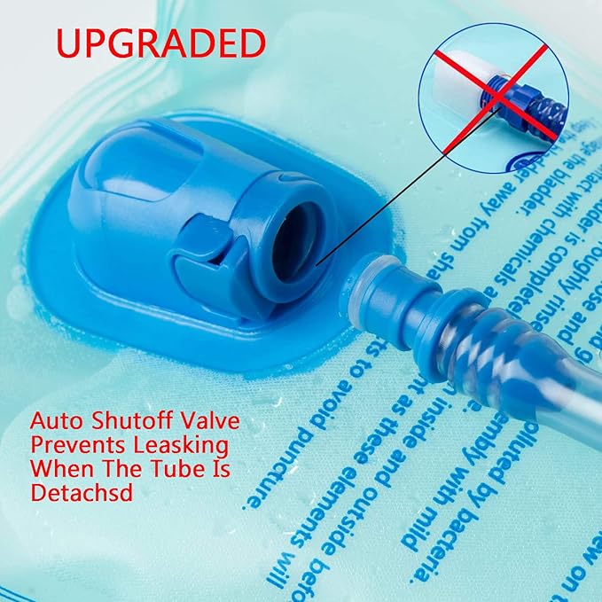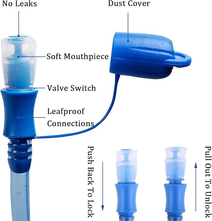 - UPGARDE LEAK PROOF:Soft yet durable mouthpiece with easily accessible ON/OFF valve prevents leakage.You can control the water flow by biting, First pull up on the drinking cap, gently bite the mouthpiece with your front teeth to have a sip and start drinking, push back to stop water flow. Quick-release tube is detachable. Auto shut off while the tube is removed, the hydration bladder will stay filled non-leaking. The water storage reservoir also has a dust cover to keep dirt out.