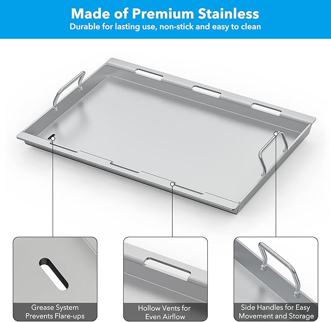 - Stainless Steel: Our patented flat top griddle is made of premium stainless steel for exceptional heat retention and durability. Non-stick surface provides stick-free cooking and easy cleaning.