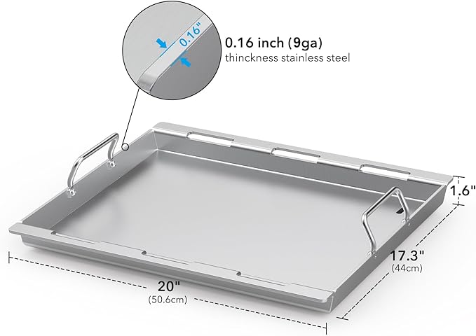 - Stainless Steel: Our patented flat top griddle is made of premium stainless steel for exceptional heat retention and durability. Non-stick surface provides stick-free cooking and easy cleaning.