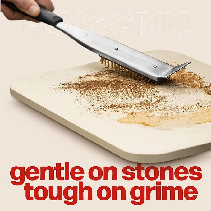 Hans Grill Cleaning Brush and Scraper for Pizza Stone/Oven | 17” 2-in-1 Tool with Non Scratch Heat Proof Brass Bristles and Stainless Steel Scraper | Heat Resistant Brush Head and Handle