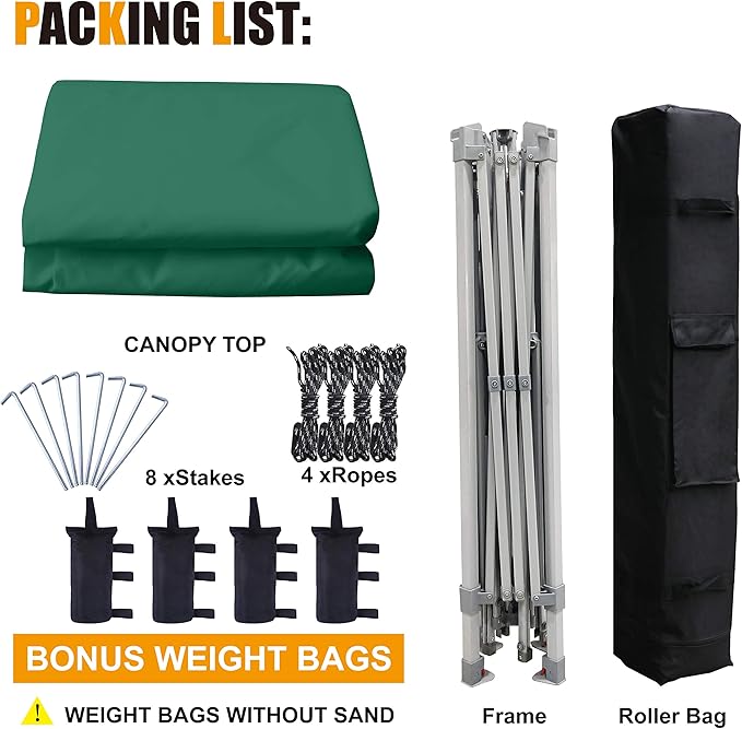- 【PARTS INCLUDED】1X patented 1-step center locking fully assembled powder-coated steel frame,1X CPAI-84 Flame retardant silver coated canopy top,1X 600D heavy stock wear resistant roller bag,4X sand bags,8X stakes and 4X ropes.NOTE: please do not leave your tent outdoors in extreme weather conditions.