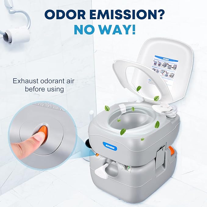 - LARGE CAPACITY WITH LEVEL INDICATOR: Kohree camping toilet owns great storage tank capacity-14.4"(L) x 16.3" (W) x 16.3"(H), with 5.8 gallons (22L) of sewage storage capacity means you'll have to empty it less often and the 3.2-gallon (12L) fresh water capacity allows you to flush about 90 times and each water volume per pump is 0.031gal, it can meet all your outdoor activities needs. Also, the portable toilet for camping is equipped with a waste water tank level indication to let you know when it's time to empty!