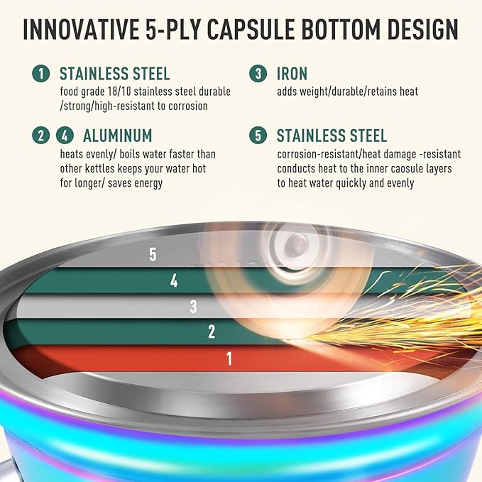 - INNOVATIVE 5-LAYER BOTTOM: Our kettle is specially developed with a 5-layered base to enhance heating performance, boil the water more quickly than other tea pot and save your time & energy. High quality teapot is not afraid of falling.