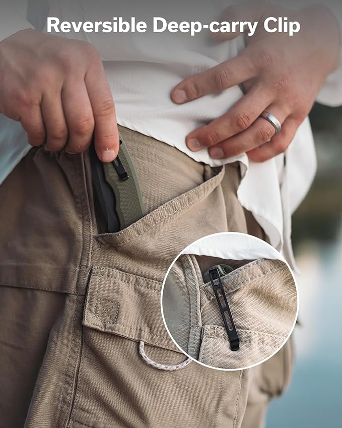 - ✅【Reversible Deep-carry Pocket Clip Knife】It's not a small knife, but it carries very well, practically disappearing in the pocket,ideal folder for camping, hunting, hiking outdoor activities,everyday working carry or collection